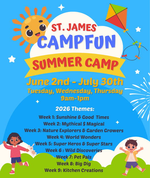 Summer days are fun days at St. James Camp Fun! Enroll now for places for children ages 2-4 years or 4-7 years old. Use the buttons below to register for Camp Fun at St. James.