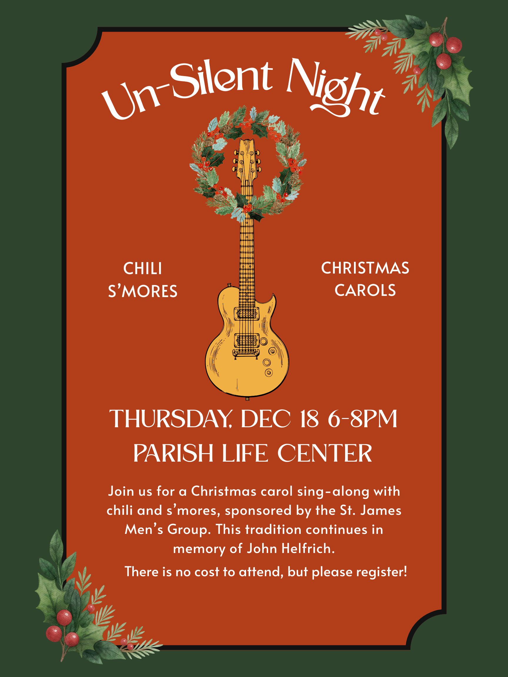Un-Silent Night, a St. James sing-along tradition, is back this year on December 18th! Join us for an evening of chili, smores, and carols in the PLC brought to you by the St. James Men's Group with music by our own Eliza Lynn Alexander. This year's event will be in honor of John Helfrich, whose songs (along with Charmaine’s puppets) filled our hearts at this event for the last several years. There is no charge for this event but please register